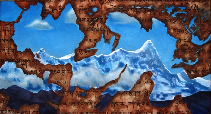 I completed this painting as a student at University of Hawaii Manoa under the benevolent guidance of a painting teacher of mine there, Mr Jason Willome. During that time I was living up valley and would spend many afternoons sitting in a coffee shop drinking chai, eating homemade manna breads and reading The Heart of The World by Ian Baker. Many sittings I enjoyed with the thick book (just over 400 pages), and with every turned page grew more enthralled in the exploration and adventure as I followed the author on his great pilgrimage deep into the mysteries of Ancient Tibet. His journeys had led him to the foothills of Namcha Barwa, one of the tallest mountains in the world and the termination point of the Far Eastern flank of the Himalayan range.